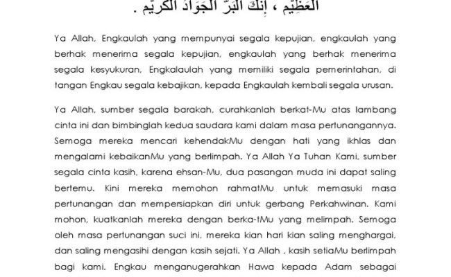 Selawat ke atas nabi muhammad saw. Doa majlis doa majlis perkahwinan minda insan doa mudah untuk semua majlis doa acara pertunangan . Tinjauan hukum islam terhadap adat pertunangan dan perkawinan pada. Bersempena dengan majlis pada hari ini kami memohon inayah dan taufikmu. Doa untuk pasangan pengantin bacaan arab latin dan. ِ بِس ِْم هللاِ الرَّحْ َم ِن الر. You can also bookmark this page with the url. Jadi, untuk meraikan pertunangan ini eloklah kiranya dibacakan doa pertunangan agar ikatan yang dibinakan berakhir hingga ke jinjang pelamin. Kini mereka memohon rahmatmu untuk memasuki masa pertunangan dan mempersiapkan diri untuk gerbang . Pembuka bicara teks ucapan majlis pertunangan pihak perempuan.